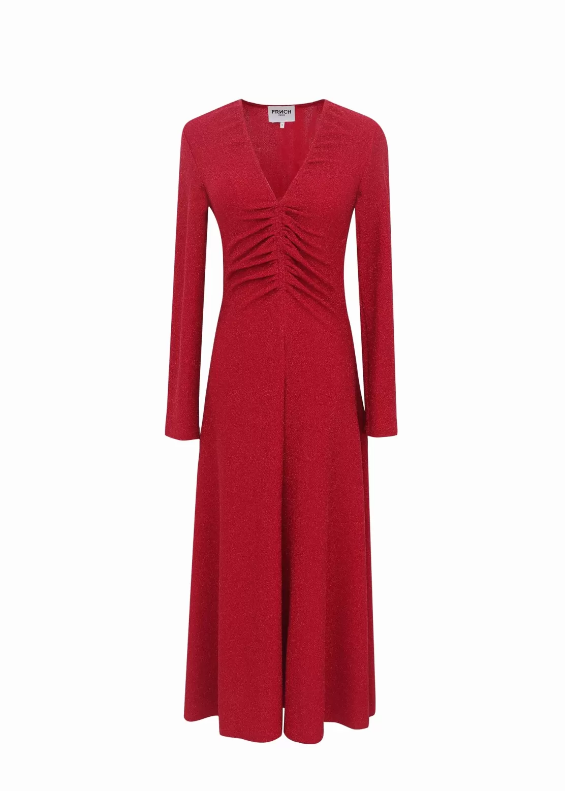 • Robe col V manches longues• Fronces au milieu à l’avant• Tissu jersey avec fil lurex
